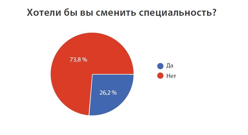 Результаты опроса показали, что значительная часть людей меняет профиль деятельности после окончания вуза. По специальности сейчас работают 64,5% респондентов, при этом 26,2% из них признались, что хотели бы поменять профессию.