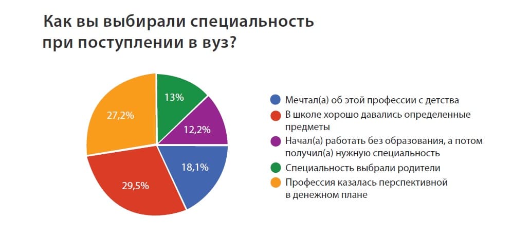 Выбор своей специальности при поступлении в вуз респонденты объяснили так: хорошо давались определенные предметы в школе (29,5%), профессия казалась перспективной в денежном плане (27,2%), мечтали об этой профессии с детства (18,1%), специальность выбрали родители (13%), сначала стали работать без образования, а потом получили нужную специальность (12,2%).