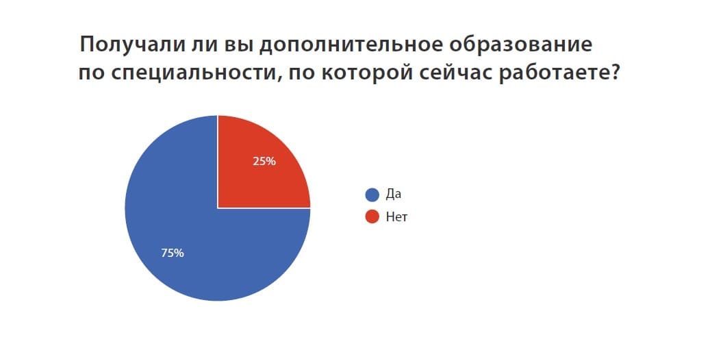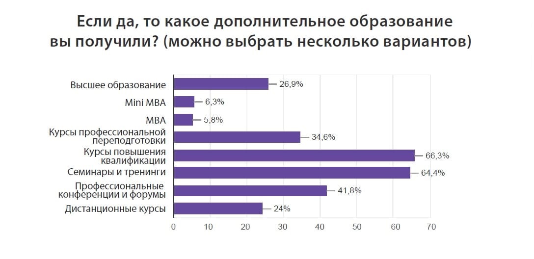При этом в 75% случаев смена профессии в итоге была подкреплена получением дополнительного образования. Самыми популярными форматами дополнительного образования среди респондентов оказались курсы повышения квалификации (66,3%) и семинары и тренинги (64,4%). Это связано, в первую очередь, с короткой продолжительностью такого обучения. Высшее же образование по новой специальности решаются получить лишь 26,9% опрошенных.