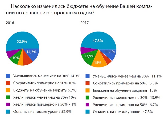 Бюджеты на обучение в 53% случаев остались на прежнем уровне, 21% опрошенных отмечают увеличение бюджетов (против 17% в 2016 году), 17% – уменьшение бюджетов (против 24% в 2016 году). При этом увеличилось число закрытых бюджетов: 15% респондентов отмечают, что их компании не планируют затраты на обучение сотрудников (против 5% в 2016 году).
